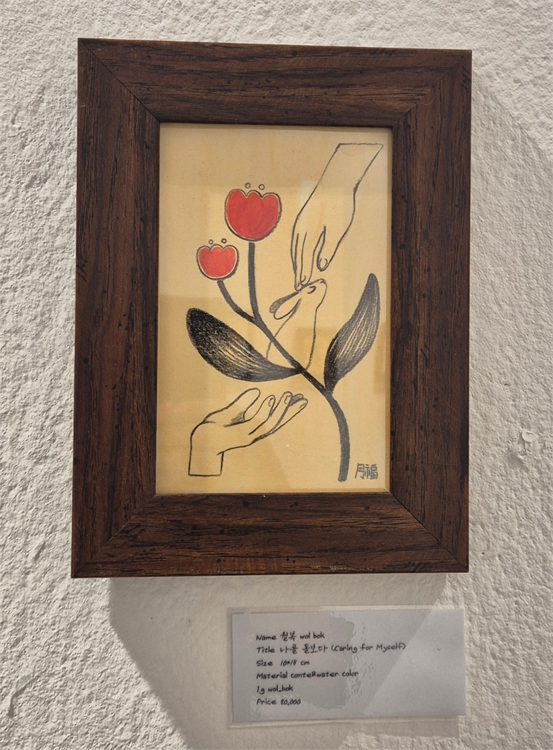 거친 콘테 선과 대비감 있는 색채는 다듬어지지 않은 감정의 결을 솔직하게 드러낸다. 잘 그리려는 욕심보다 즐거운 상태에서 자연스럽게 이어진 선들은 낙서처럼 자유롭고, 그래서 더욱 진실한 감정의 흔적으로 남는다. 이번 전시는 완성된 결과물을 보여주기보다, 감정에 머무르는 한 작가의 태도와 시간을 기록하는 자리로 읽힌다.