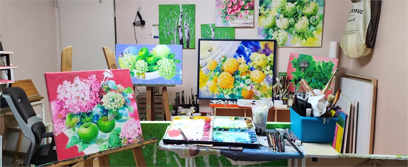 서울 송파구 문정동의 ‘그림이즈’ 화실에 들어서면 벽면 가득 펼쳐진 캔버스가 관람객을 맞는다. 꽃과 나비, 사과와 햇살이 어우러진 장면들이 한눈에 들어오며, 자연의 숨결과 빛의 결을 동시에 느낄 수 있다. 이곳에서 윤혜진 작가는 자연을 모티프로 순간의 감정과 빛을 기록한다.윤 작가의 주요 소재는 꽃과 나비다. 꽃은 섬세한