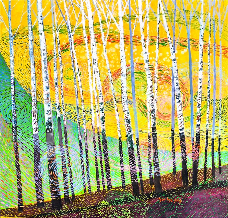 햇살을 머금은 자작나무들이 하늘을 향해 뻗어있는 그림 앞에 섰을 때, 저도 모르게 미소 짓게 되었습니다. 마치 하늘을 향해 찬양을 드리는 것 같은 하얀 나무들 사이로 붉은 노을이 쏟아지고 있었거든요.