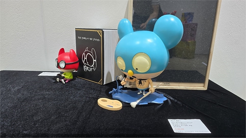 The Power of the Letters | PVC, 합금, 크리스탈 | 11.3×10.2×16.4cm | 2021 (왼), Hero Artist(Blue) | 혼합재료, 유리섬유, 메탈 | 20×20×35(h)cm | 2019 (오)