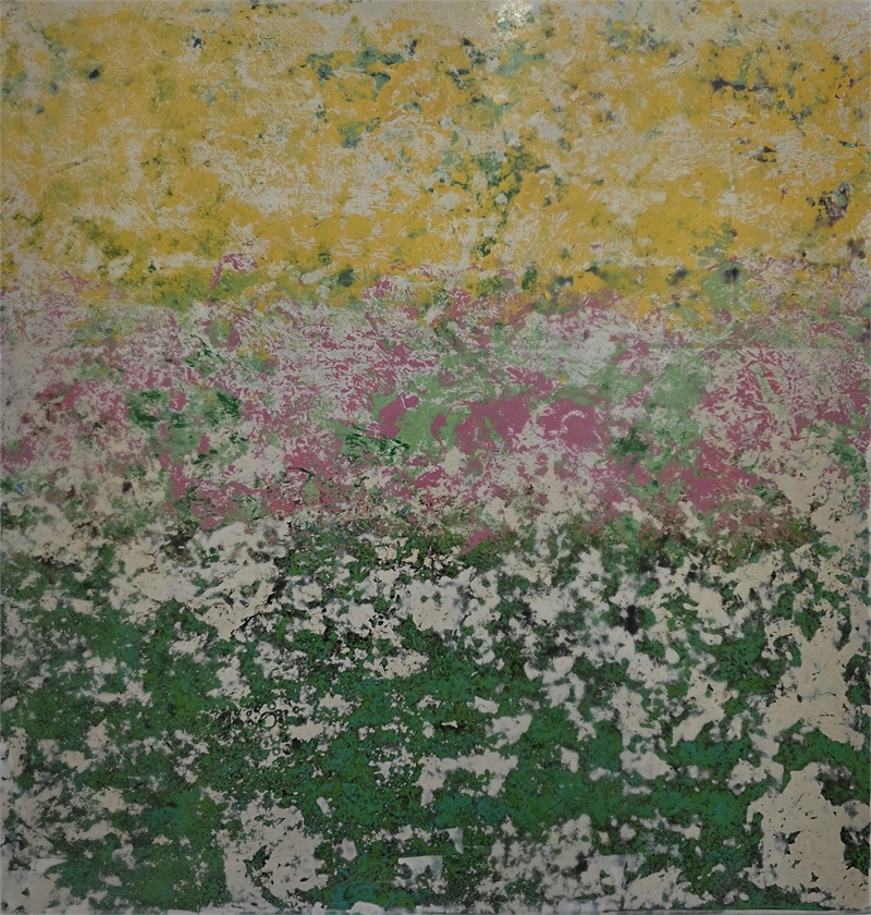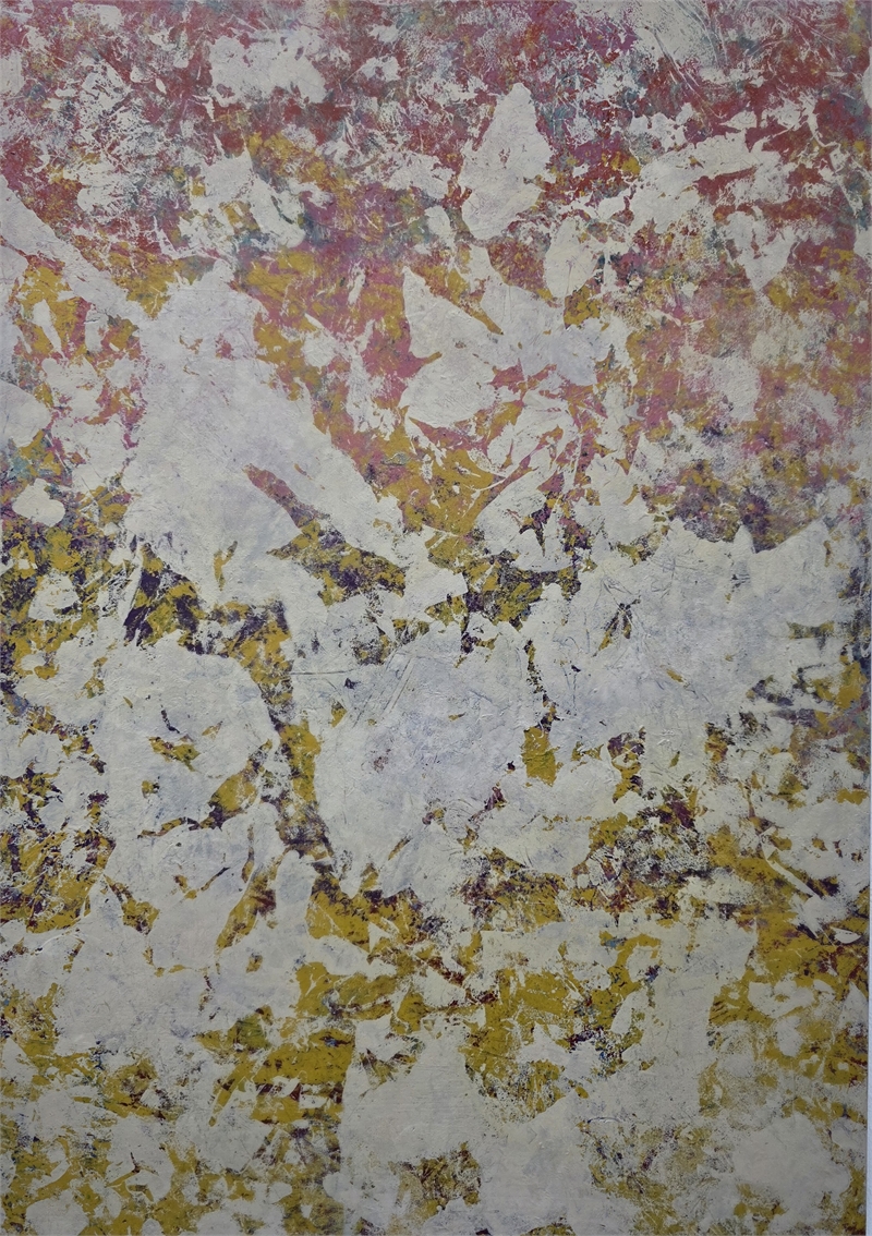 「카르마의 흔적」은 윤회를 넘어, 모든 행위가 남긴 흔적이 되돌아오는 순환을 형상화한 작품이다. 겹겹이 칠해진 색은 내면의 감정과 반복된 선택의 결과를 품고 있으며, 덧칠되고 드러난 색의 결은 기억과 망각의 경계를 암시한다.