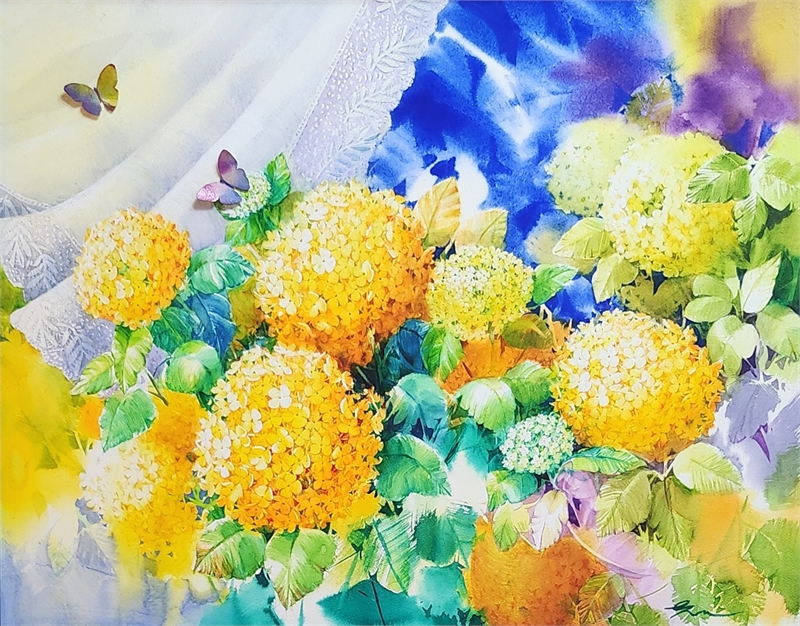 윤 작가의 주요 소재는 꽃과 나비다. 꽃은 섬세한 아름다움과 일상의 행복을, 나비는 변화와 생동감을 상징한다. 작품 속 사과는 풍요와 충만을, 노란 수국은 희망과 에너지를 담는다. 특히 노란 수국은 국내 화단에서 보기 드문 소재로, 강렬한 색채와 독창성으로 주목받고 있다.