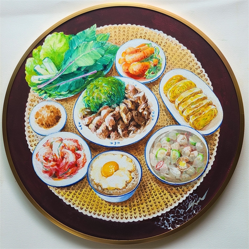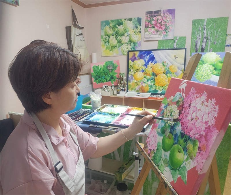 그녀의 회화는 치밀한 묘사로 잘 알려져 있다. 한 송이 꽃을 그리기 위해 수십 번의 붓질이 겹겹이 쌓이고, 빛과 그림자가 교차하는 순간이 섬세하게 포착된다. 나비의 날개는 실제로 날아오를 듯 생생한 생동감을 전한다. 최근에는 ‘엄마의 밥상’을 주제로 한 정물화 시리즈를 준비 중이다. 가족의 온기와 추억을 음식과 식탁 풍경 속에 담아내며, 정물화에 새로운 이야기를 불어넣으려는 시도다.