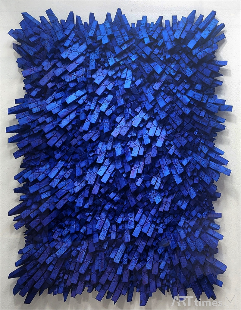 이번 전시에서는 작가의 대표적 색조인 적색 계열과 청색 계열 작품이 함께 공개된다. 붉은 작품들은 노랑·주황·적색이 중첩되며 불길처럼 솟구치는 강한 에너지를 드러내고, 가까이에서 보면 수많은 조각들이 서로 충돌하며 산맥처럼 솟아오르거나 깊은 골을 이루는 장면이 관찰된다. 반면 푸른 작품들은 심해나 우주를 연상시키는 차가운 밀도를 품고 있으며, 명도 변화에 따라 정보 단위의 생성과 소멸이 시각적으로 표현된다.