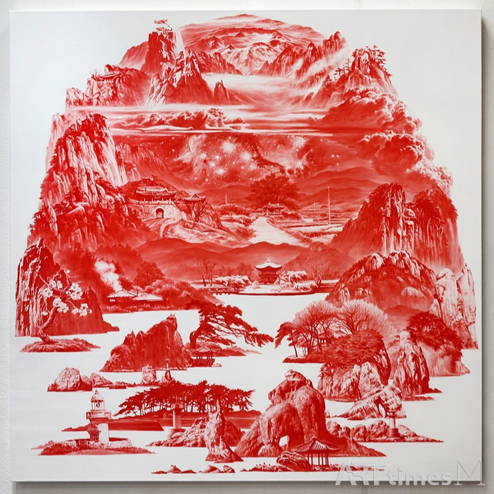 전통적인 산수의 요소 위에 성문, 고건축물, 해안선, 누각 등이 자리하지만, 그것은 특정 시대를 지시하지 않는다. 붉은색의 긴장과 온도는 역사적 시간의 흔적, 자연의 생명력, 공동체의 정서를 한층에 포개며, 작품 자체가 하나의 ‘집단적 기억 지도’처럼 기능한다.