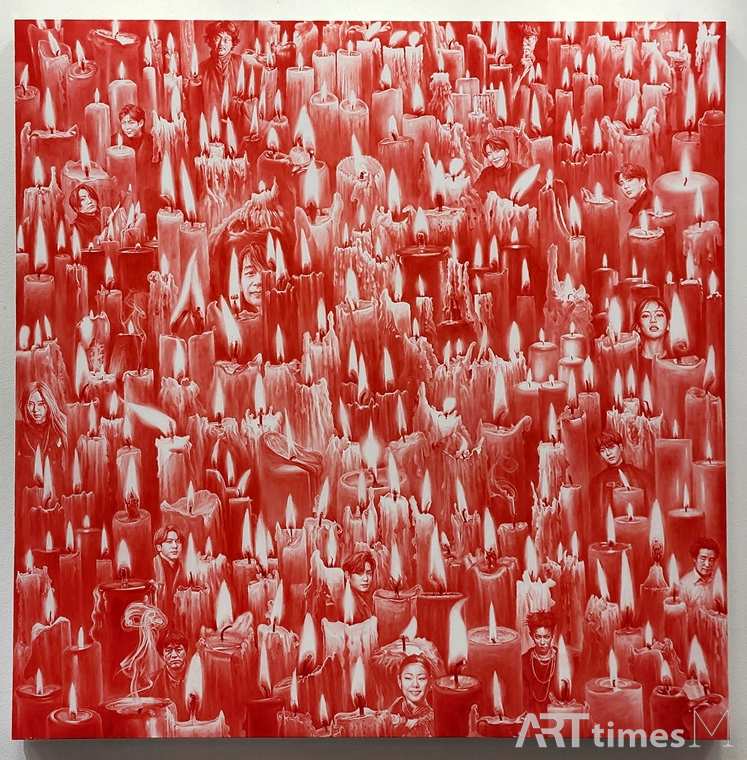 이번 전시에서는 작가의 대표 연작인 〈Beyond Red〉 시리즈뿐 아니라, 붉은 화면 위에 촛불을 모티프로 한 초상 작업도 새롭게 공개된다. 촛불의 흔들리는 빛 속에서 떠오르는 인물들은 특정 인물을 지시하기보다, 사회의 변화를 이끌어온 예술가·시민·창작자들을 상징하는 존재로 제시된다.