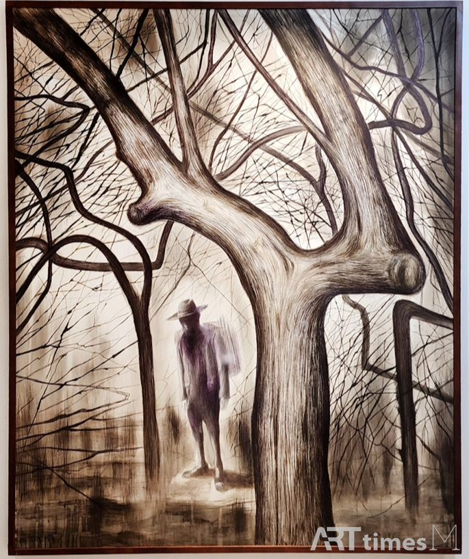 김성룡 작가의 회화는 선명함과 흐릿함, 현실성과 몽환성, 실체와 비실체가 한 화면에서 조용히 충돌하며 긴장감을 형성한다. 인물의 얼굴은 뚜렷하지만 동시에 흔들리는 잔상처럼 남고, 나뭇가지와 숲의 밀도는 내면의 감정이나 기억의 결을 상징한다.
