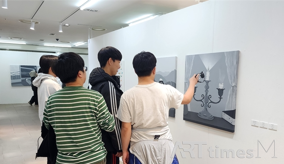문현고 학생들이 일본작가 브루모리(Burumori)의 회색조 작품 [lighter,2024]를 감상하고있다. 자료제공: 엠아트센터