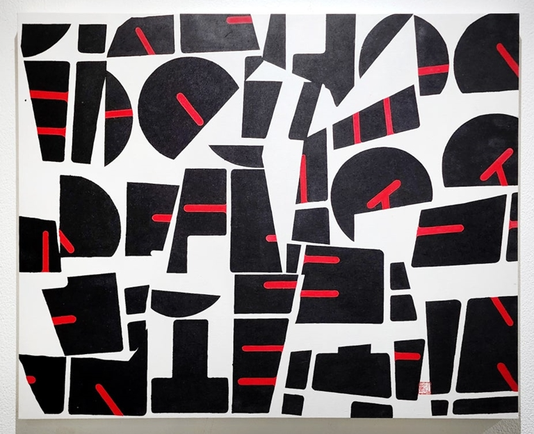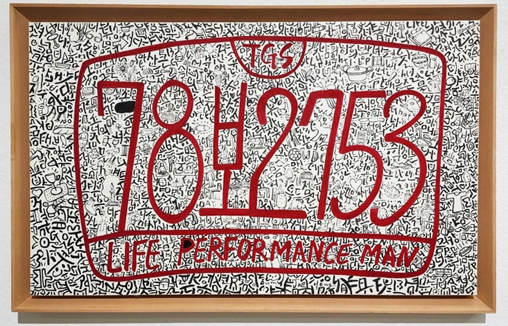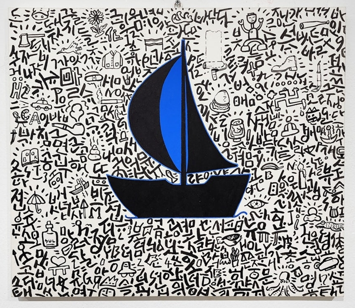 엄재홍의 작품은 언뜻 문자처럼 보이지만 명확히 읽히지 않는 기호들로 화면을 가득 채운다. 반복되는 검은 붓질과 리드미컬한 획, 그리고 빨강·노랑·파랑의 강렬한 색채는 무의식 속에서 떠오른 이미지의 잔상을 시각적으로 기록한 듯한 인상을 준다. 이 기호들은 의미를 전달하기보다 ‘느껴지는 언어’로 작동하며, 질서와 혼돈의 경계에서 화면 전체에 긴장과 밀도를 형성한다. 반복되는 형상 속에 간헐적으로 등장하는 색의 변주와 상징적 이미지들은 기억의 왜곡과 전이, 그리고 무의식의 작동 방식을 연상시킨다.